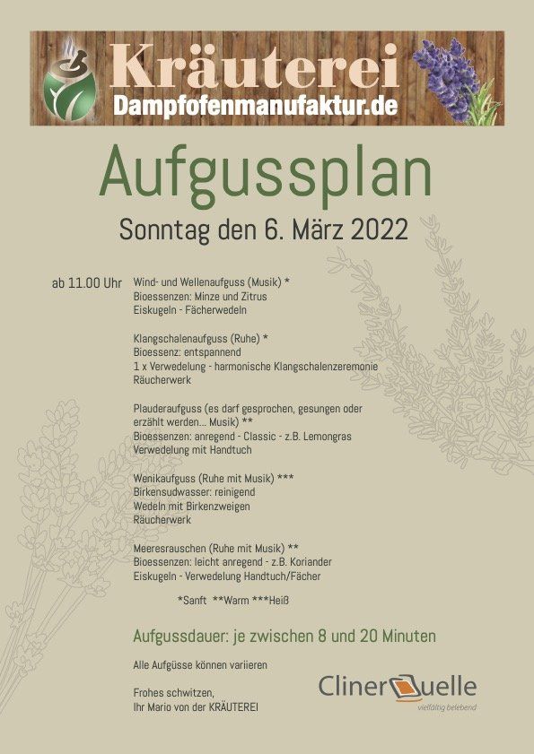 - Aufgussplan in Absprache - Änderungen und Saisonale Themen möglich